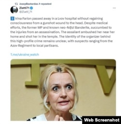 Durante casi una hora, medios de comunicación rusos, blogueros y canales de Telegram recordaron el conflicto de Farion con «neonazis rusoparlantes» el año pasado, hasta que la publicación rusa Ukraina.ru (perteneciente al holding federal Rossiya Segodnya) «lanzó» finalmente una versión de venganza, que fue recogida por la publicación Readovka, vinculada al Kremlin, que incluyó en el círculo de sospechosos a «residentes ordinarios de Lviv rusoparlantes».