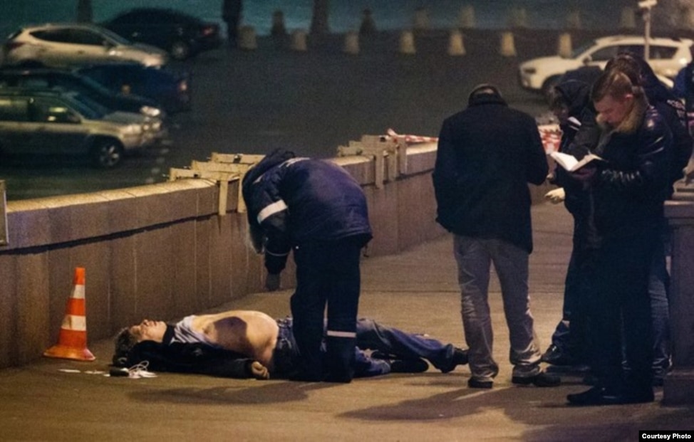 El cuerpo de Boris Nemtsov en el lugar del asesinato, en Moscú, febrero de 2015. Fuente: Fotografía de fuentes abiertas.