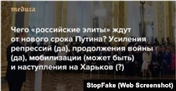 El 26 de marzo, el medio opositor ruso Meduza publicó una "filtración controlada" de una "fuente anónima" del Kremlin sobre el deseo de Putin de "liquidar la operación militar especial" tras la "toma de Járkiv".